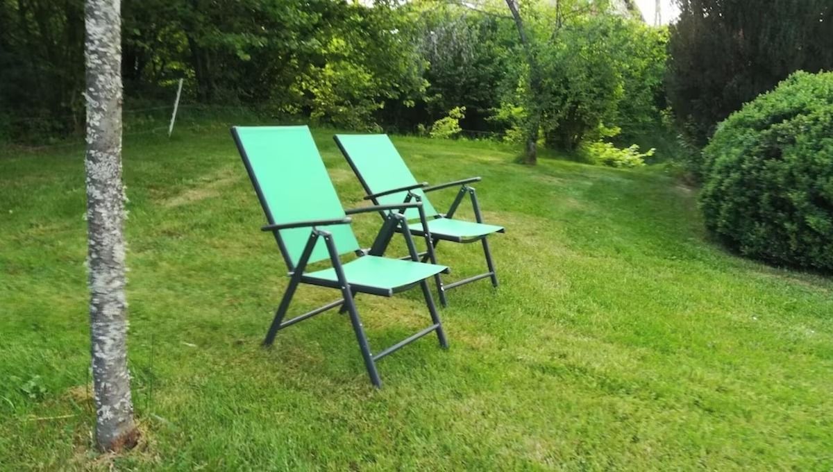 Le gîte bénéficie d’un terrain privatif de 1500 m², parfait pour profiter de la nature environnante. La terrasse en bois offre une grande table, un salon de jardin et un barbecue, idéal pour les repas d’été en plein air.